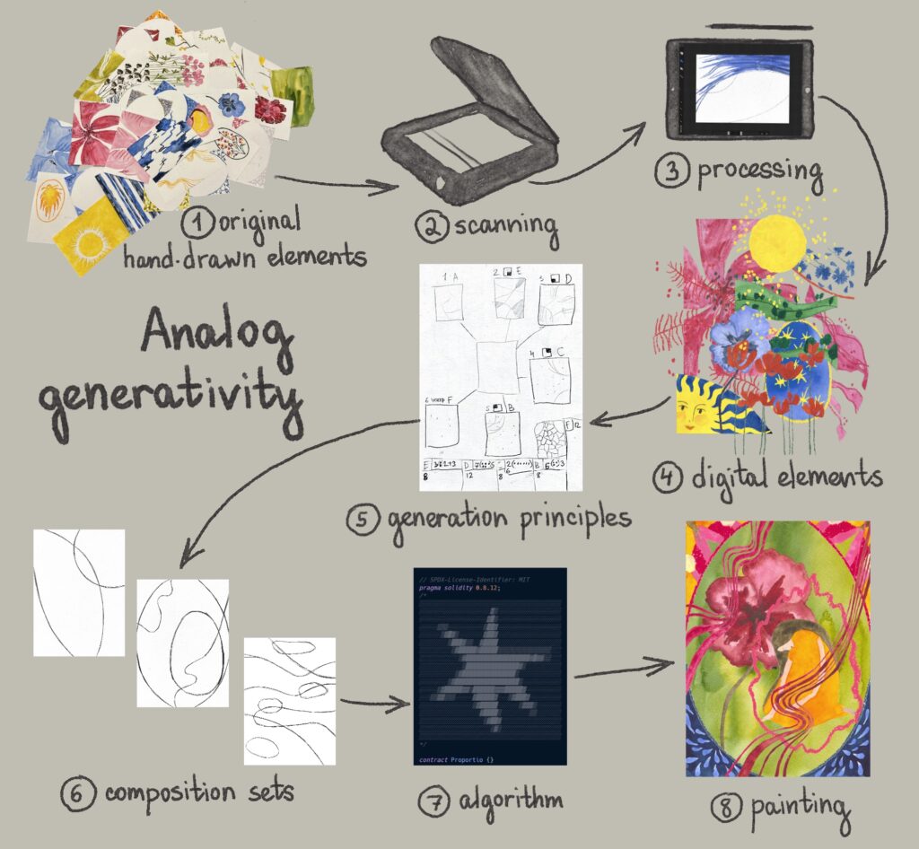 Creating such a work required rethinking the medium itself, called the concept of a dynamic canvas. Its main characteristic is the time during which the work can continue to reveal itself to us. It must function autonomously and reliably, possible only through the blockchain.